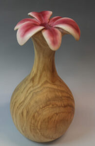 Learn how to create a completely hollowed bud vase with a carved flower on top. In this demo I show you how I hollow vessels with narrow necks from the bottom using spindle gouges, bowl gouges and a goose neck hollower. After the piece is turned I demonstrate how I layout a daylily flower and carve it. I also show how I use an airbrush to blend in colors on the tops of the petals.